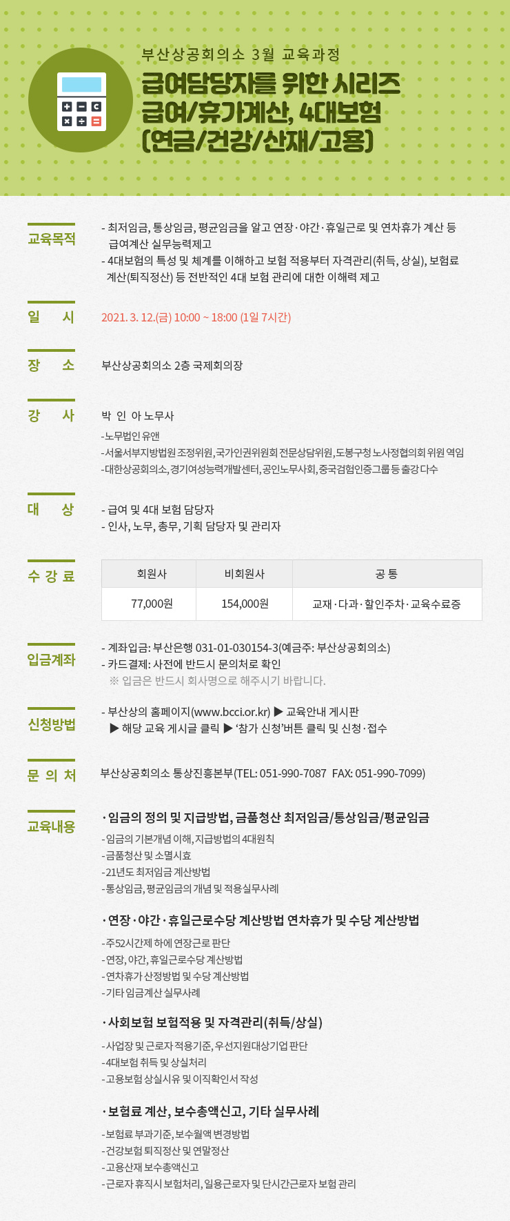 - 수강료 카드결제는 온라인 참가신청 후, 전화(Tel. 051-990-7087)로 사전등록 하시면 됩니다.