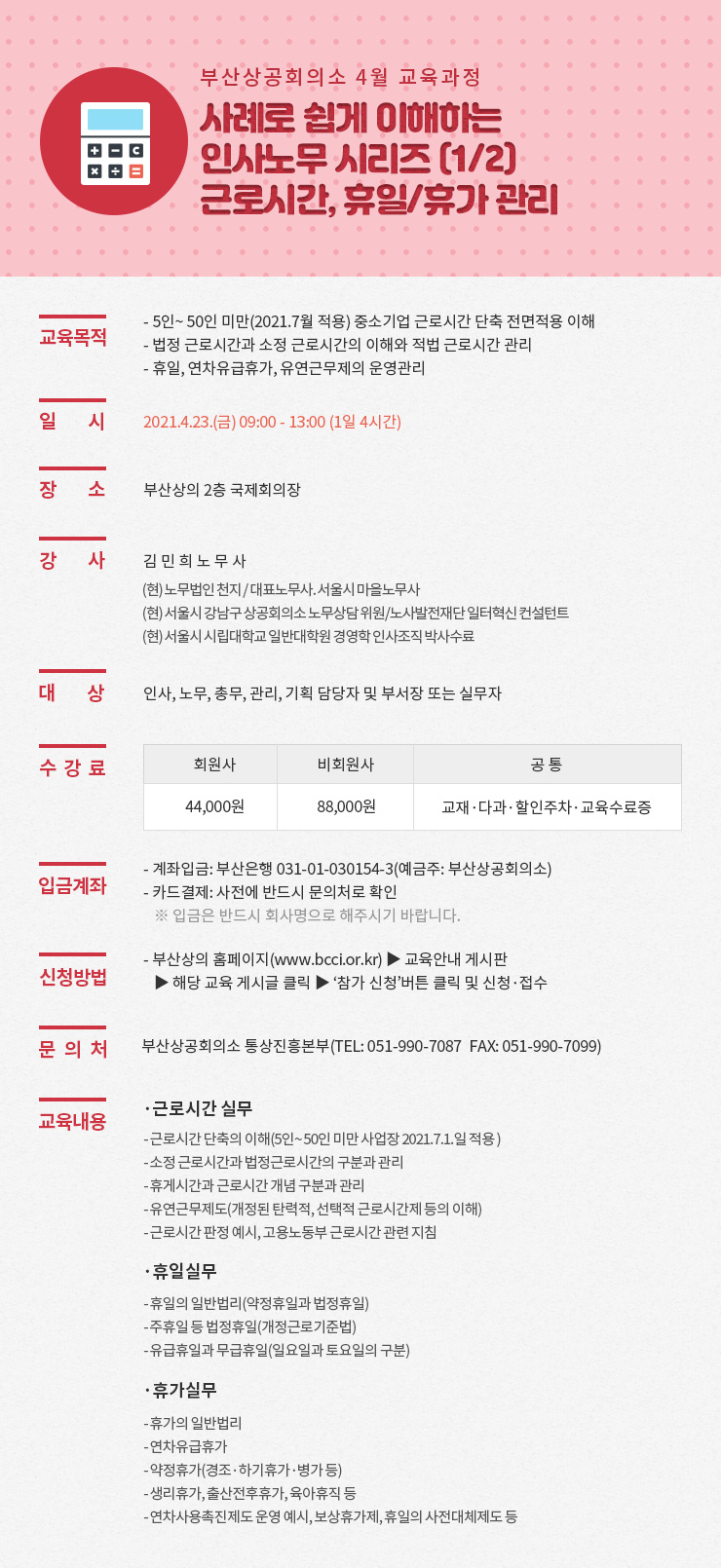 - 수강료 카드결제는 온라인 참가신청 후, 전화(Tel. 051-990-7065)로 사전등록 하시면 됩니다.