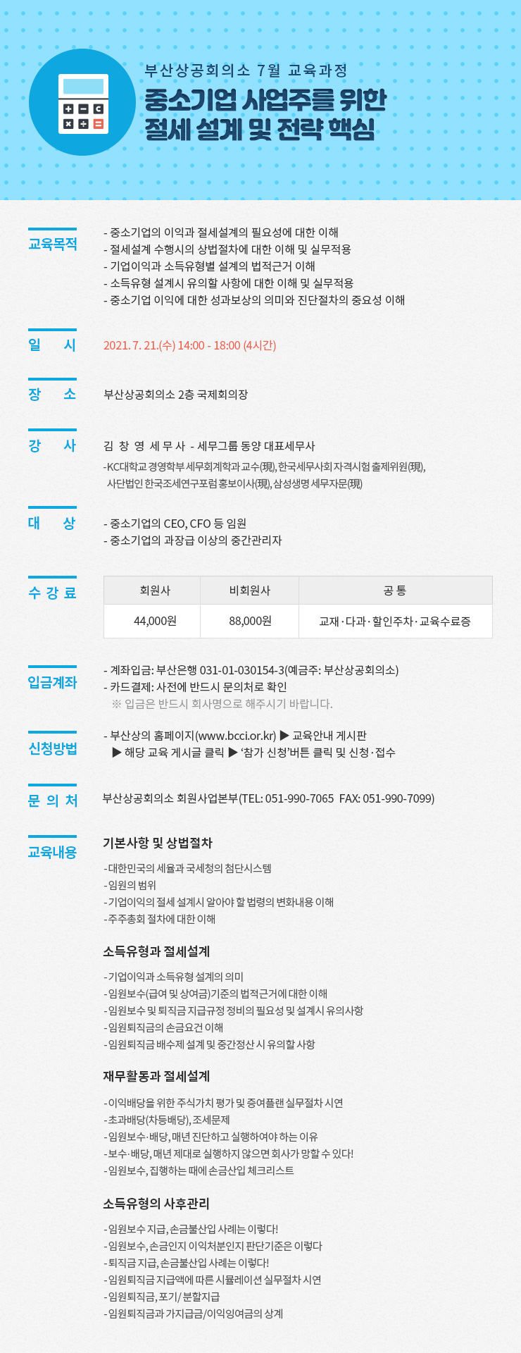 - 수강료 카드결제는 온라인 참가신청 후, 전화(Tel. 051-990-7065)로 사전등록 하시면 됩니다.