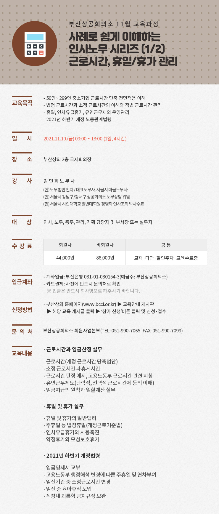- 수강료 카드결제는 온라인 참가신청 후, 전화(Tel. 051-990-7065)로 사전등록 하시면 됩니다.