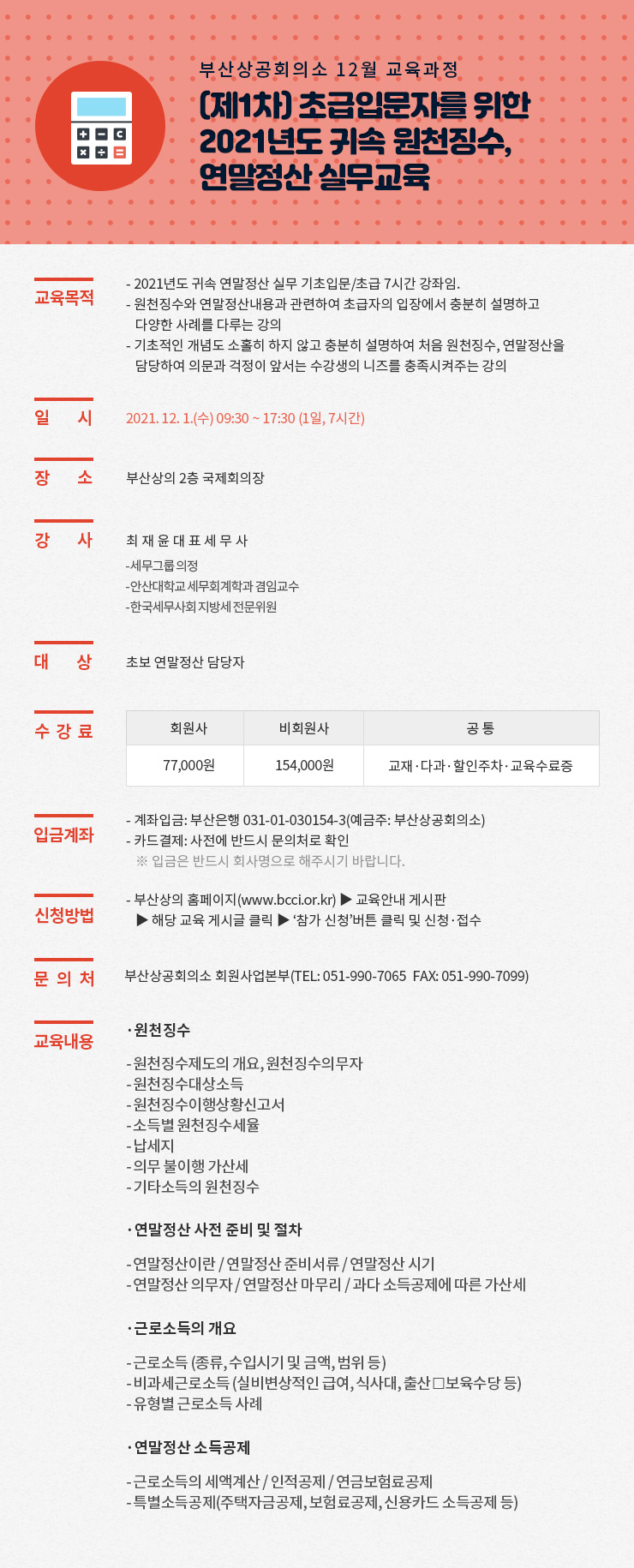 - 수강료 카드결제는 온라인 참가신청 후, 전화(Tel. 051-990-7065)로 사전등록 하시면 됩니다.