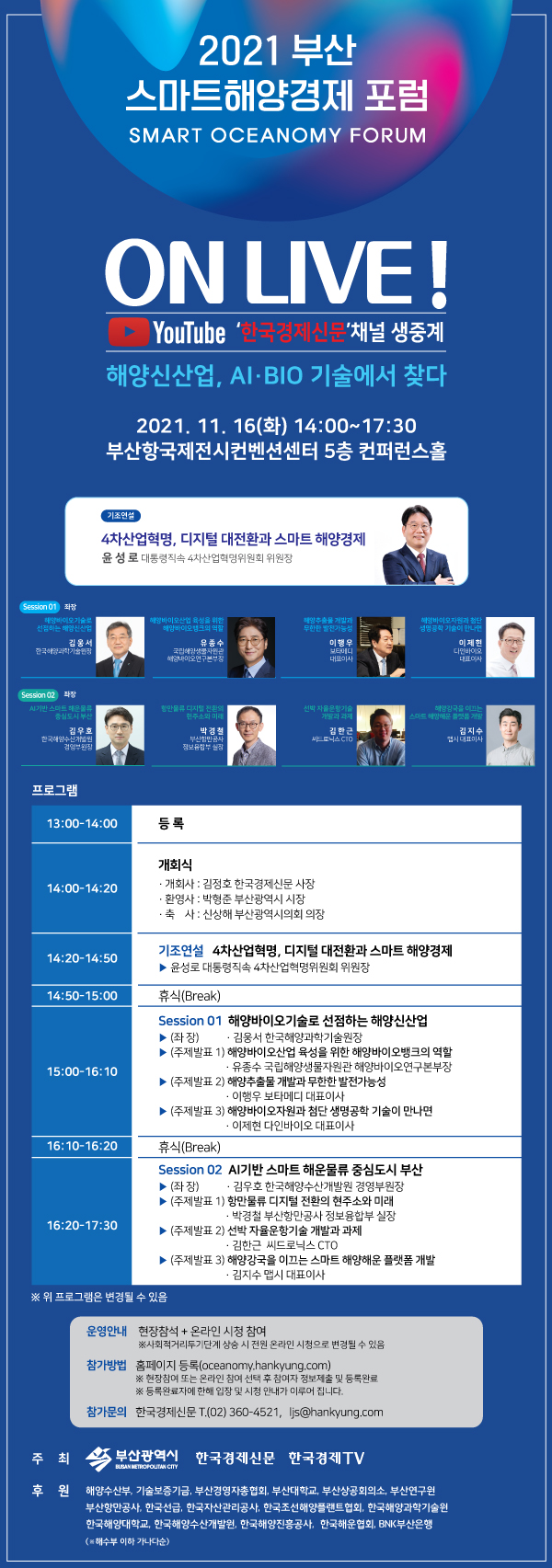 부산광역시와 한국경제신문, 한국경제TV가 공동으로 오는 11월 16일에 「2021 부산 스마트해양경제 포럼」을 개최합니다. 많은 분들의