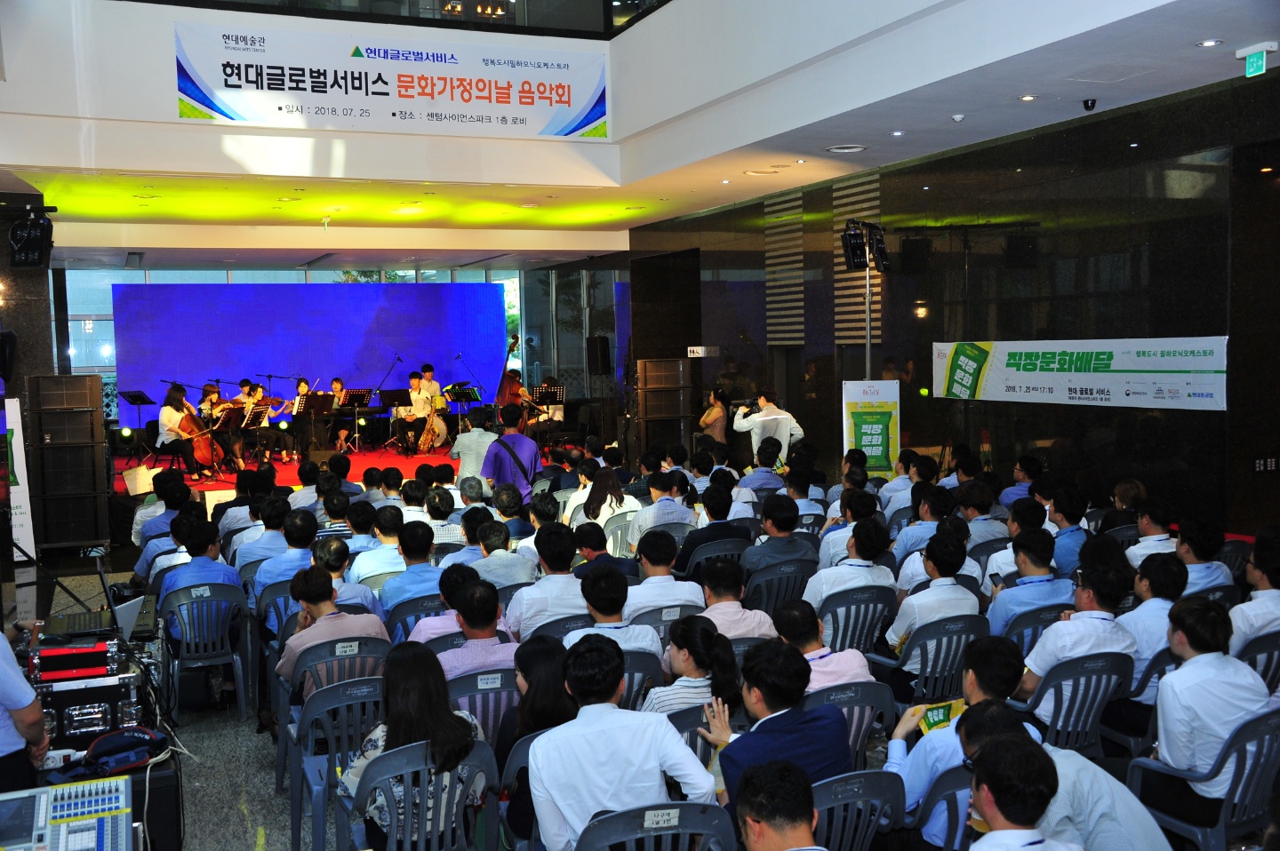 현대글로벌서비스 임직원을 위한 ‘직장 배달 콘서트’가 지난 7월 25일(수) 오후 5시 해운대센텀사이언스파크 1 층 로비에서 열렸다. ‘직장 배달 콘서트’는 신나는 직장문화를 조성하기 위해 연주단, 예술가들이 전국의 생산 현장과 기업을 찾아다니며 문화를 나누는 사업으로, 문화체육관광부 주최로 지난 2014년부터 열리고 있다. 이날 콘서트에는 현대글로벌서비스 직원들을 비롯해 인근 회사 직장인 등 400여 명이 모여 ‘행복도시 필하모닉 오케스트라’의 클래식 연주를 감상하며, 절정에 이른 무더위를 달랬다. 공연을 맡은 ‘행복도시 필하모닉 오케 스트라’는 캐논, 헝가리 무곡 등 대중적인 클래식 음악과 유명 영화 및 애니메이션 OST를 신나고 흥미롭게 편곡 해 클래식이 익숙하지 않은 관객들에게도 큰 박수를 받았다. 한편, 현대글로벌서비스는 지난 2016년 11월 부산 해운대에 설립된 선박 엔지니어링 서비스 전문회사로 올해 상반기 친환경 선박개조 서비스 분야에서 1억 2천만 달러를 수주하는 등 괄목할 만한 성장세를 보이고 있다.