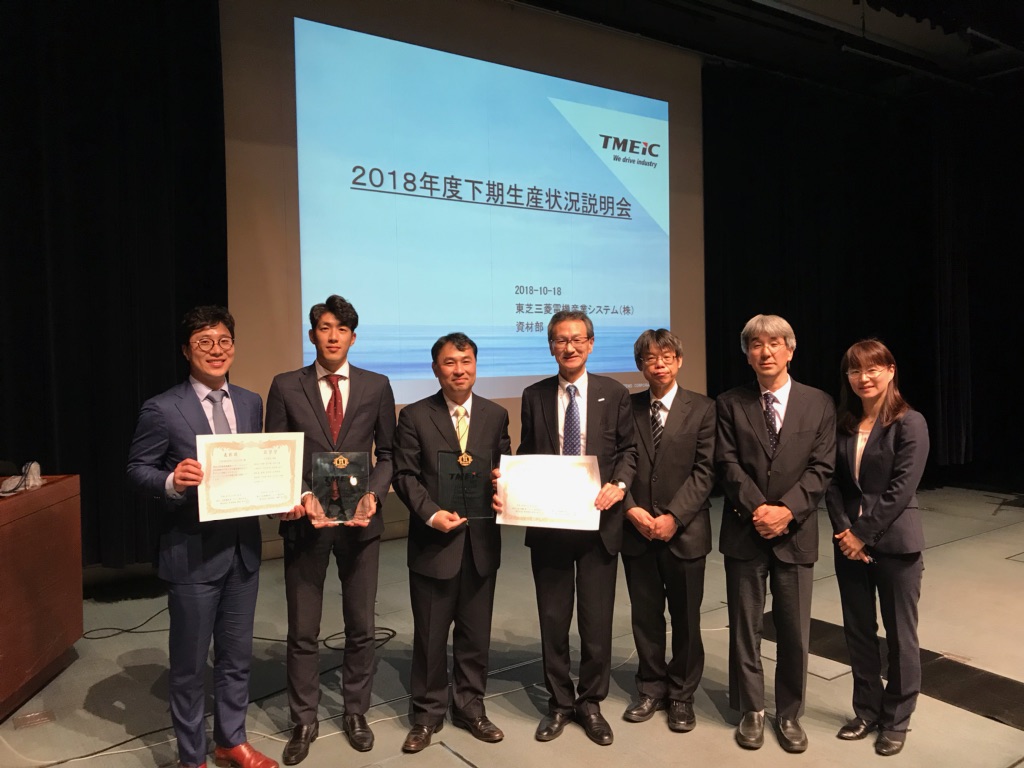 ㈜태웅은 일본 플랜트 산업, 전기 및 자동화 시스템 전문 업체인 TMEIC의 우수 협력사로 선정되어 표창을 받았다. 통합운영본부 허 욱 전무이사와 영업부문 박재훈 사원이 10월 18일 TMEIC 초청으로 일본 가와 사키시 산업진흥 회관에서 열린 TMEIC 수여식에 참석했다. 이번 수여식은 TMEIC 업적에 크게 공헌한 거래처를 대상으로 표창을 수여하는데 ㈜태웅은 22P-6600kW 동기 전동기용 SPIDER, SHAFT를 단조 제작부터 정삭 가공까지 최선을 다해 납기 단축에 크게 협력하기에 이상을 수상하였다.