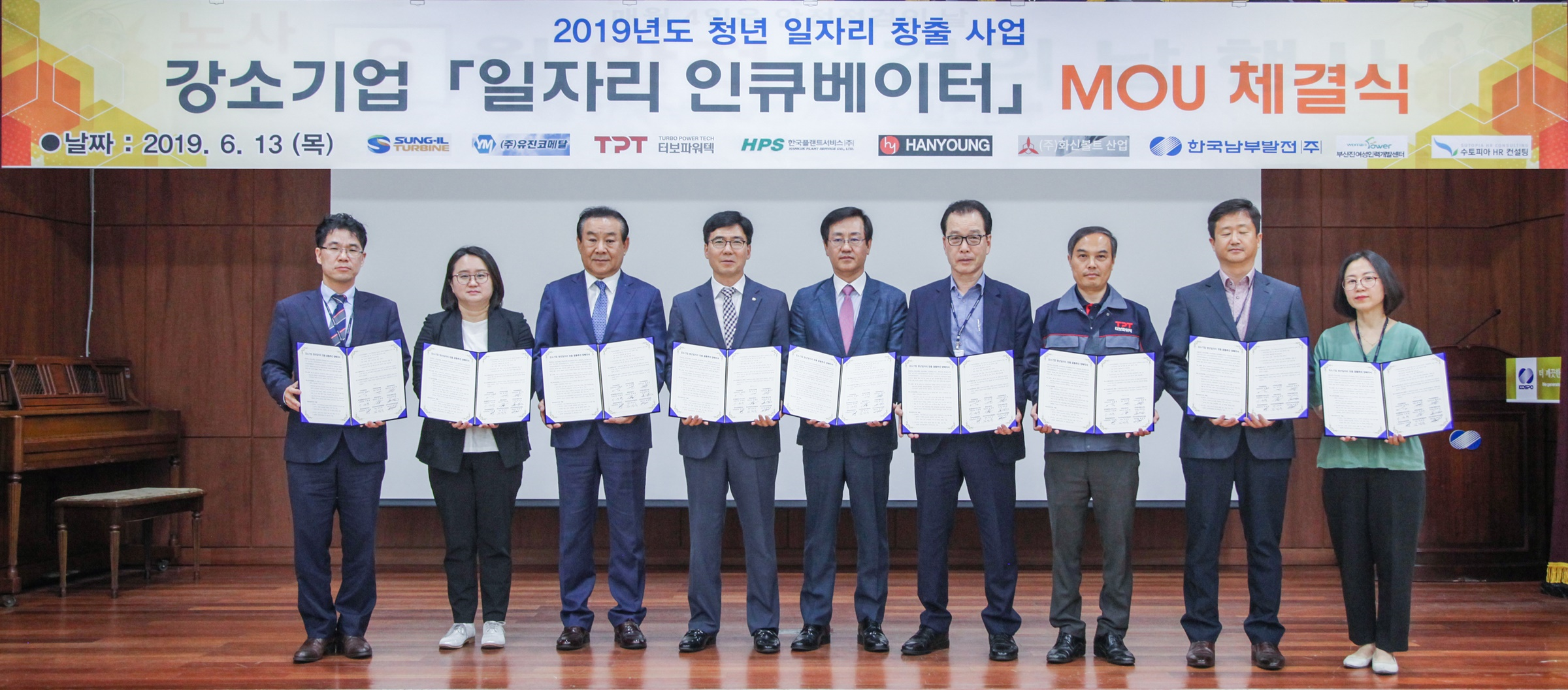 한국남부발전은 지난 6월 13일 부산 감천동 소재 부산발전본부에서 선도적인 청년 일자리 창출을 위하여 발전업 연계 강소기업과 정부 산하기관, 전문 교육기관과 협업체계 구축을 위해 6개 강소기업(성일터빈, 유진코메탈, 터보파워텍, 한국플랜트서비스, 한영산업, 화신볼트산업) 및 부산진여성인력개발센터, 수토피아HR컨설팅과 ‘강소기업 일자리 인큐베이터 MOU’를 체결했다. 강소기업 일자리 인큐베이터는 청년 일자리 창출 프로그램으로 자격증 취득에서부터 기업별 현장실습과 NCS 기초직무역량교육, 직장체험 등을 통해 우수학생에 대한 정규직 채용까지 One-Stop으로 지원하는 사업이다.